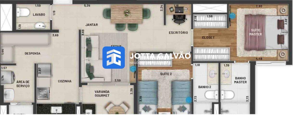 A unidade conta com 2 suítes e 3 banheiros, garantindo conforto e praticidade. O apartamento dispõe de área de serviço, varanda, e churrasqueira. Conta também com 2 vagas de garagem cobertas, com hobby box e infraestrutura elétrica.