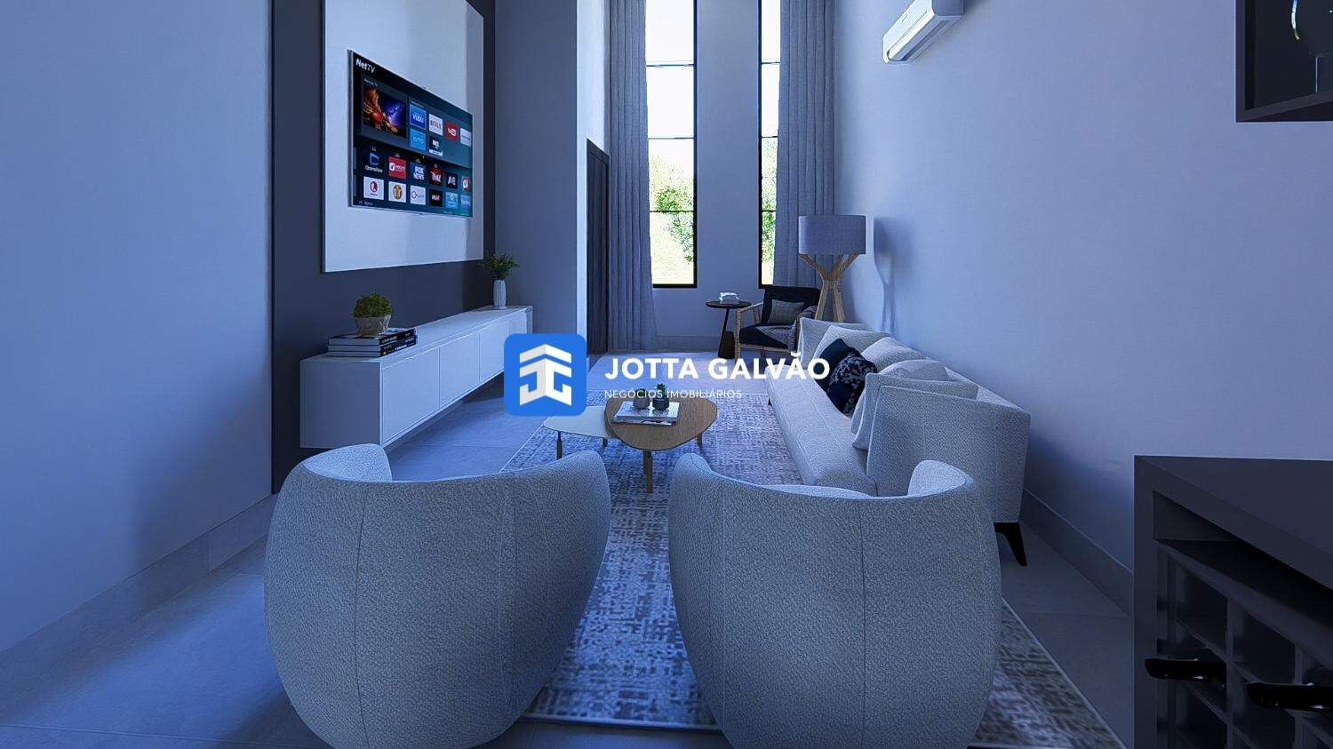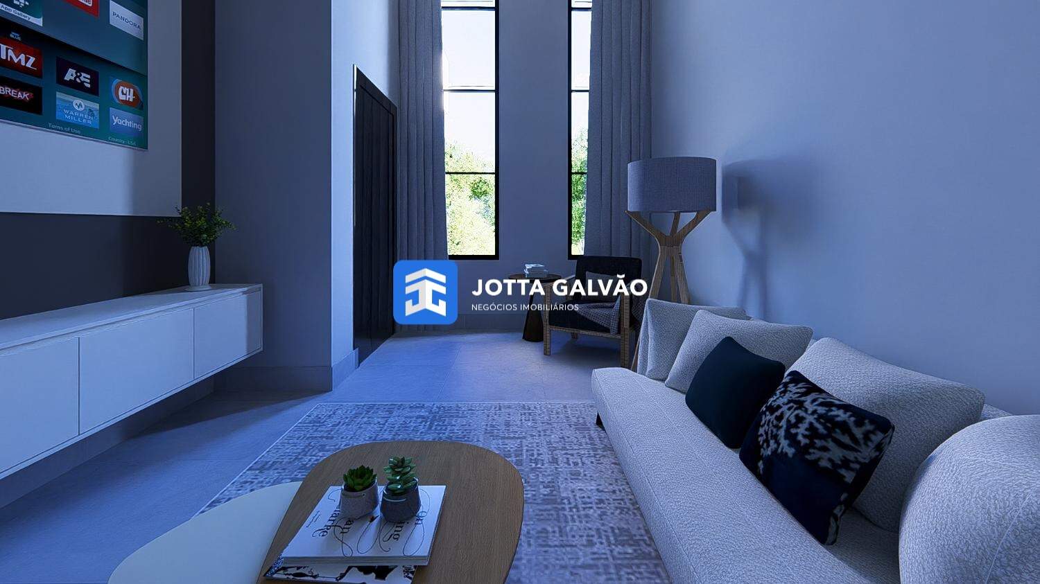 Sala de estar/jantar com pé direito duplo