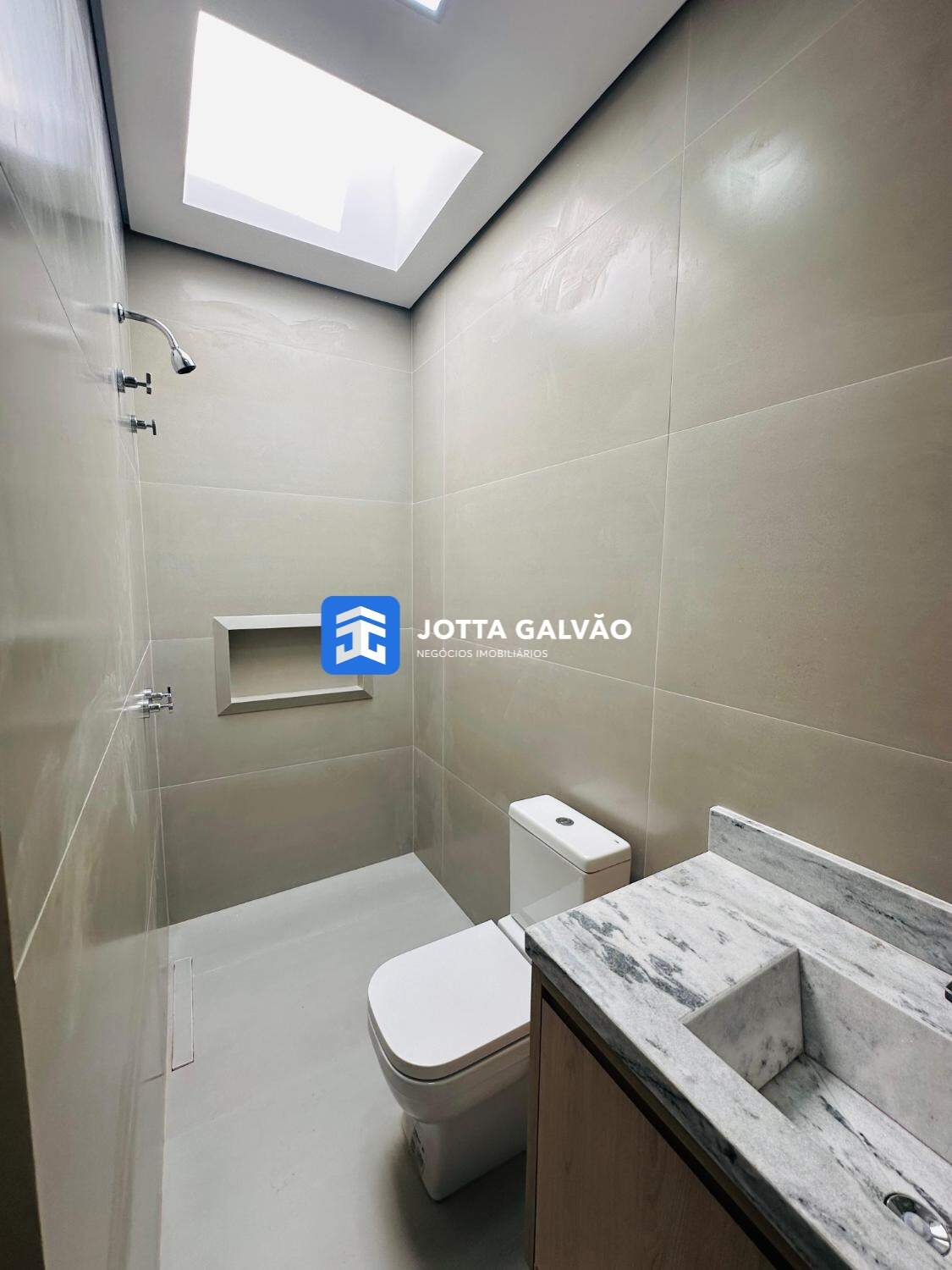 Suíte master com closet e banheiro com claraboia.