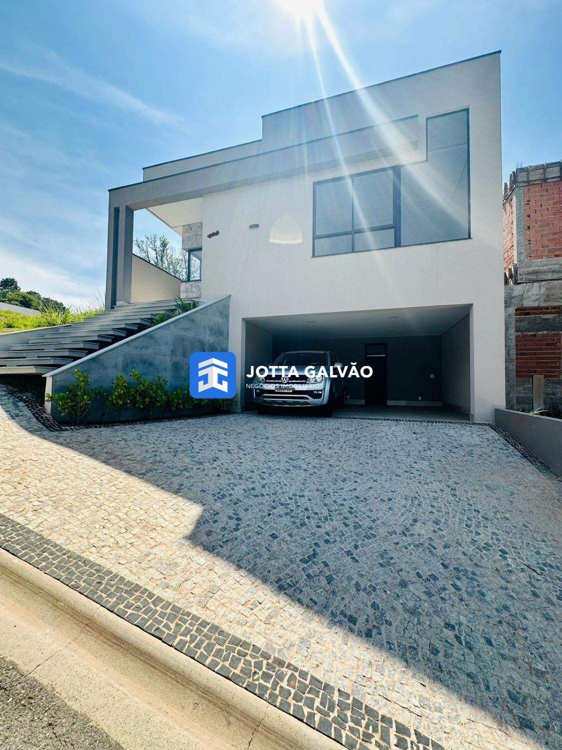Garagem coberta para 3 carros e 3 descobertas.
