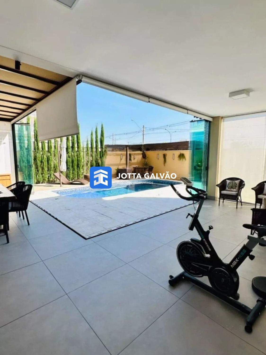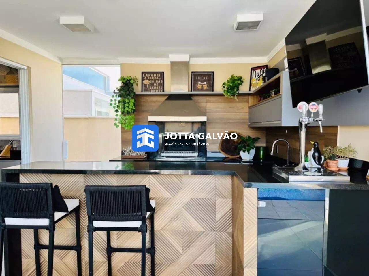 Área gourmet coberta, fechada com vidro e persianas automatizadas, integrada ao quintal e equipada com chopeira