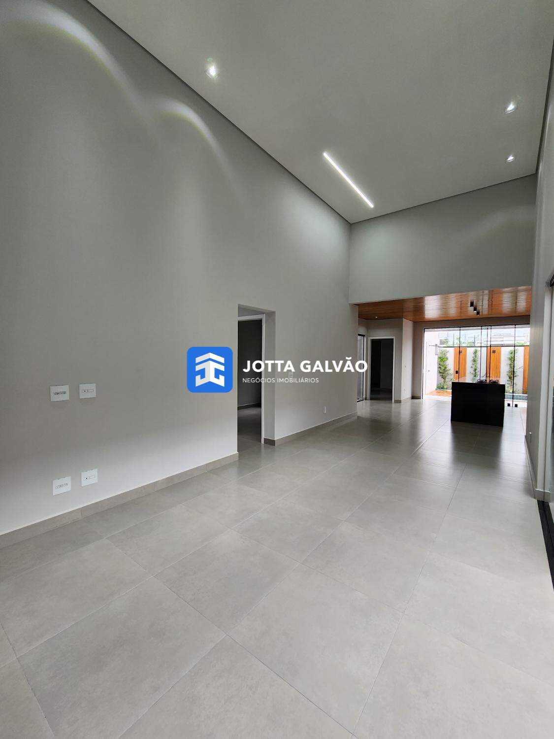 Sala de estar com pé direito duplo, integrando-se à varanda com pergolado.