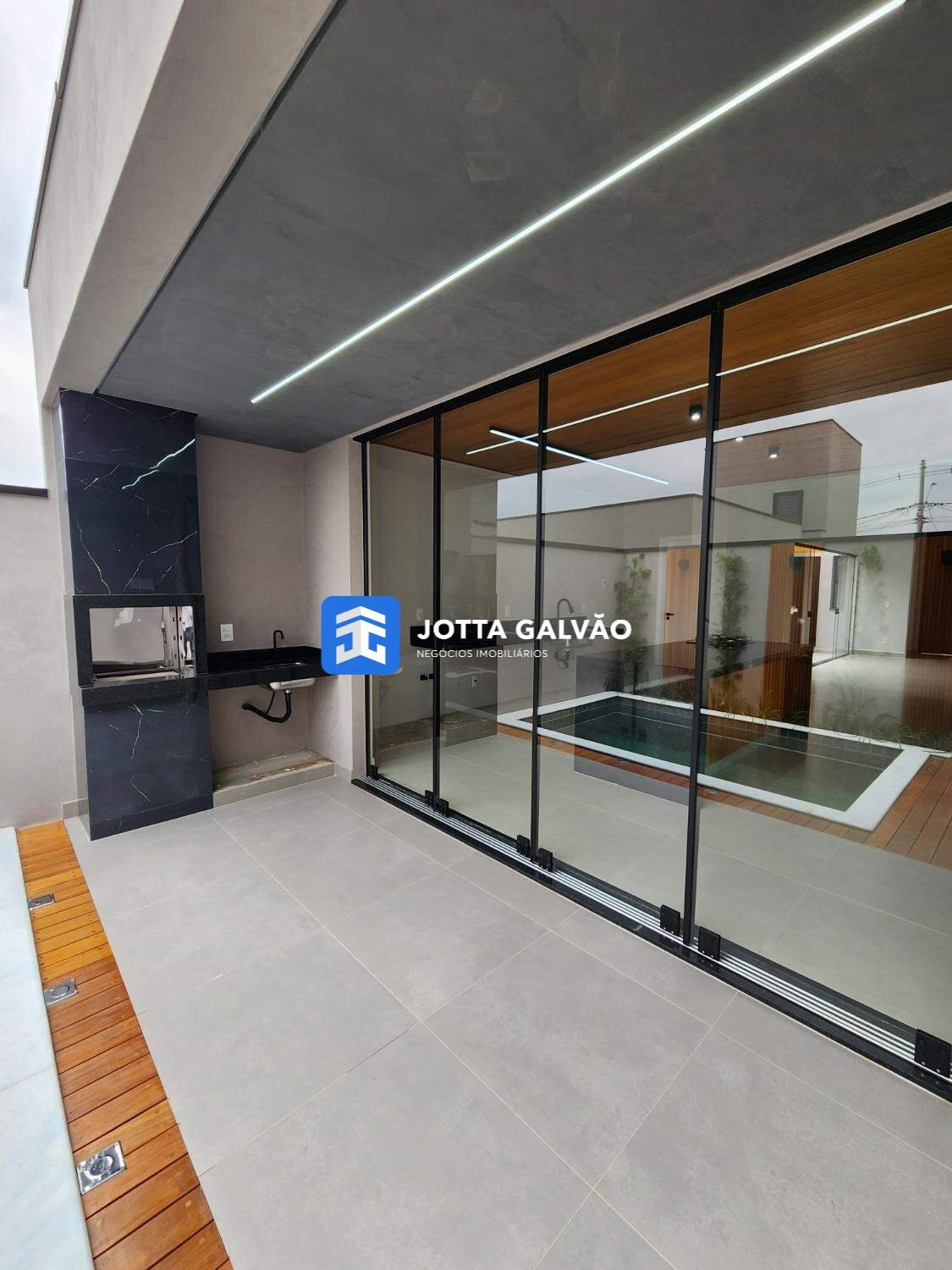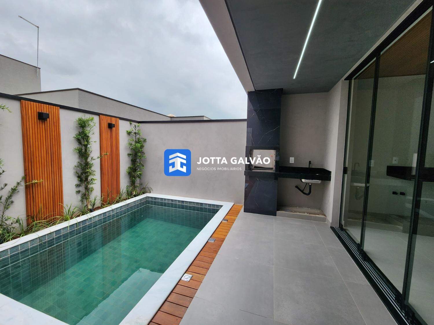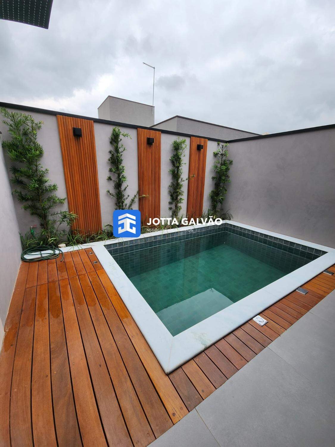 Piscina com deck em madeira para momentos de lazer e relaxamento.