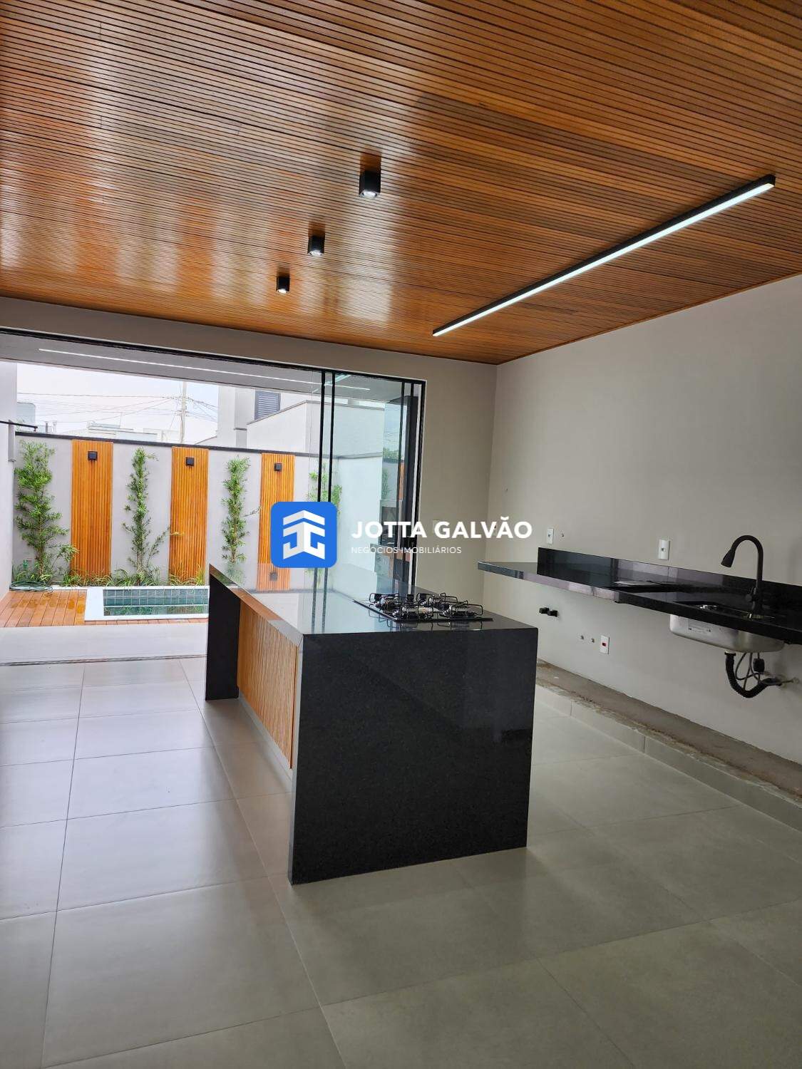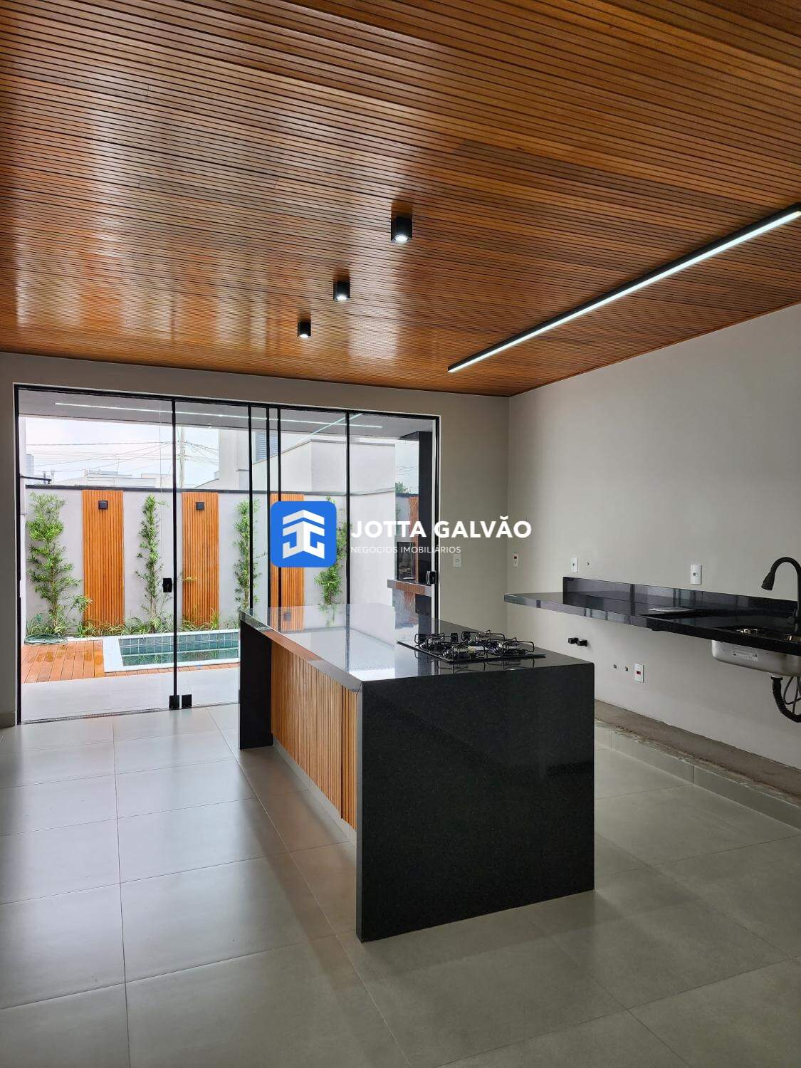 Cozinha moderna com forro ripado em madeira nobre, combinando sofisticação e funcionalidade.
