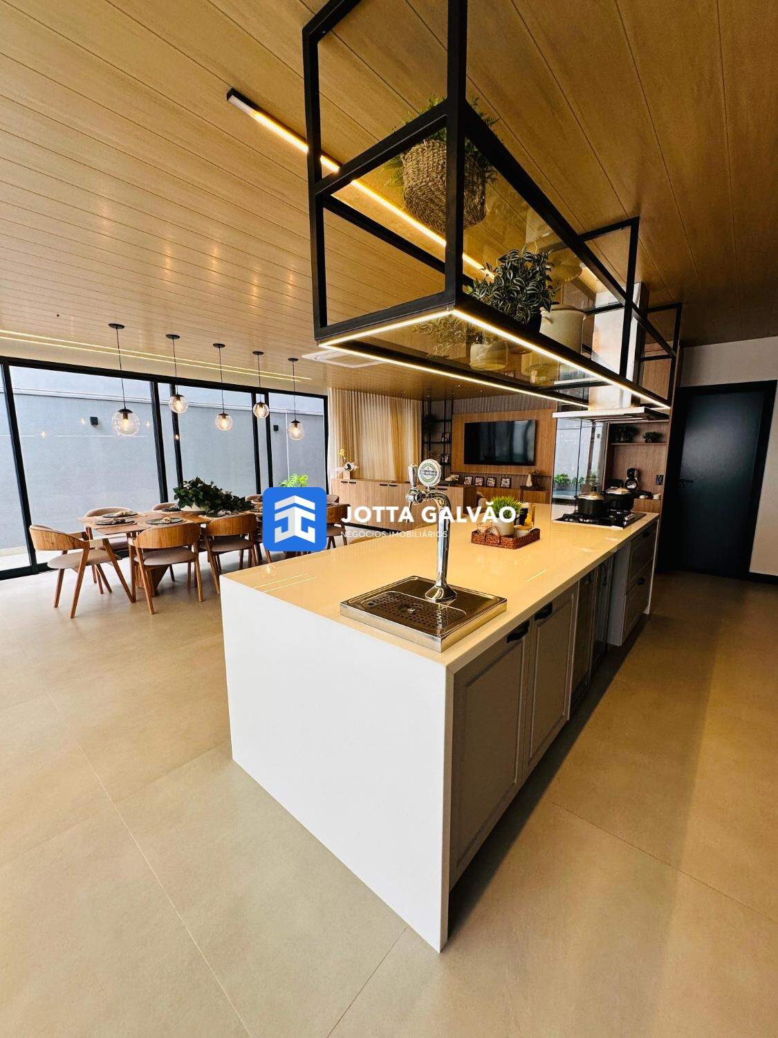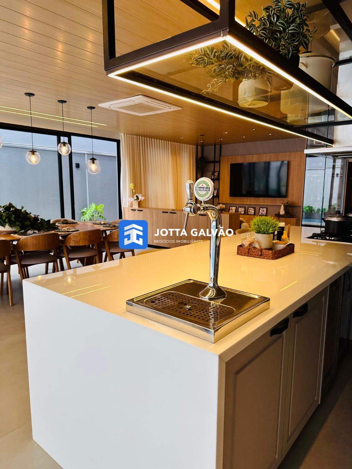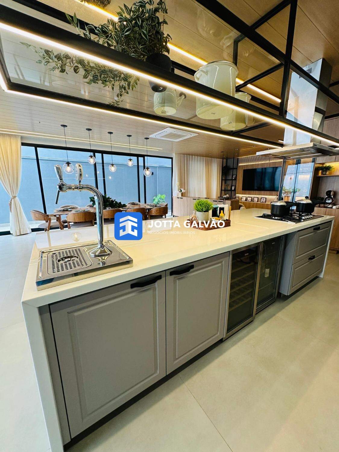 A área social é um espetáculo à parte, com uma sala ampla, sala de jantar imponente, e uma cozinha moderna com ilha espaçosa, acabamentos em nanoglass e armários planejados no estilo provençal. A área gourmet, integrada com a cozinha, conta com churrasqueira americana e uma chopeira, oferecendo o ambiente perfeito para receber familiares e amigos. A piscina aquecida e a iluminação de LED em toda a casa complementam o luxo deste imóvel.